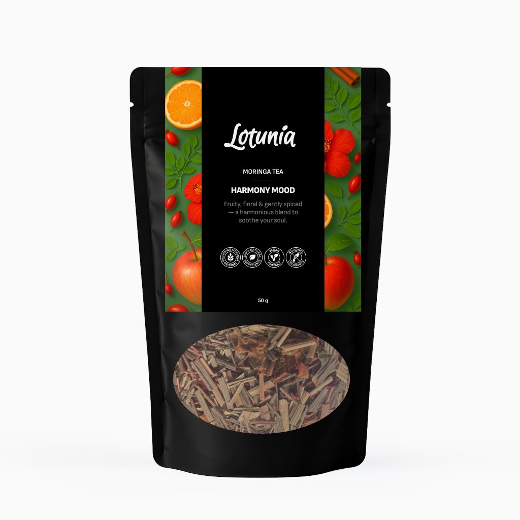 Zloženie: Citrónová tráva, kvet ibišteka, šípkové šupky, kúsky jablka, kúsky pomaranča, moringa olejodárna (Filipíny), mletá škorica, okvetné lístky ruže, aróma čučoriedky.