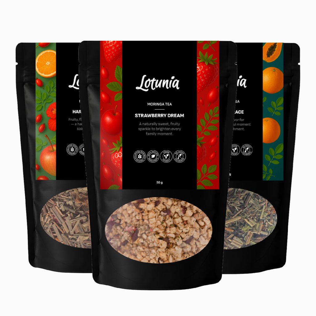 - Harmony Mood – harmonizujúca zmes ibišteka, ruže, škorice a moringy.